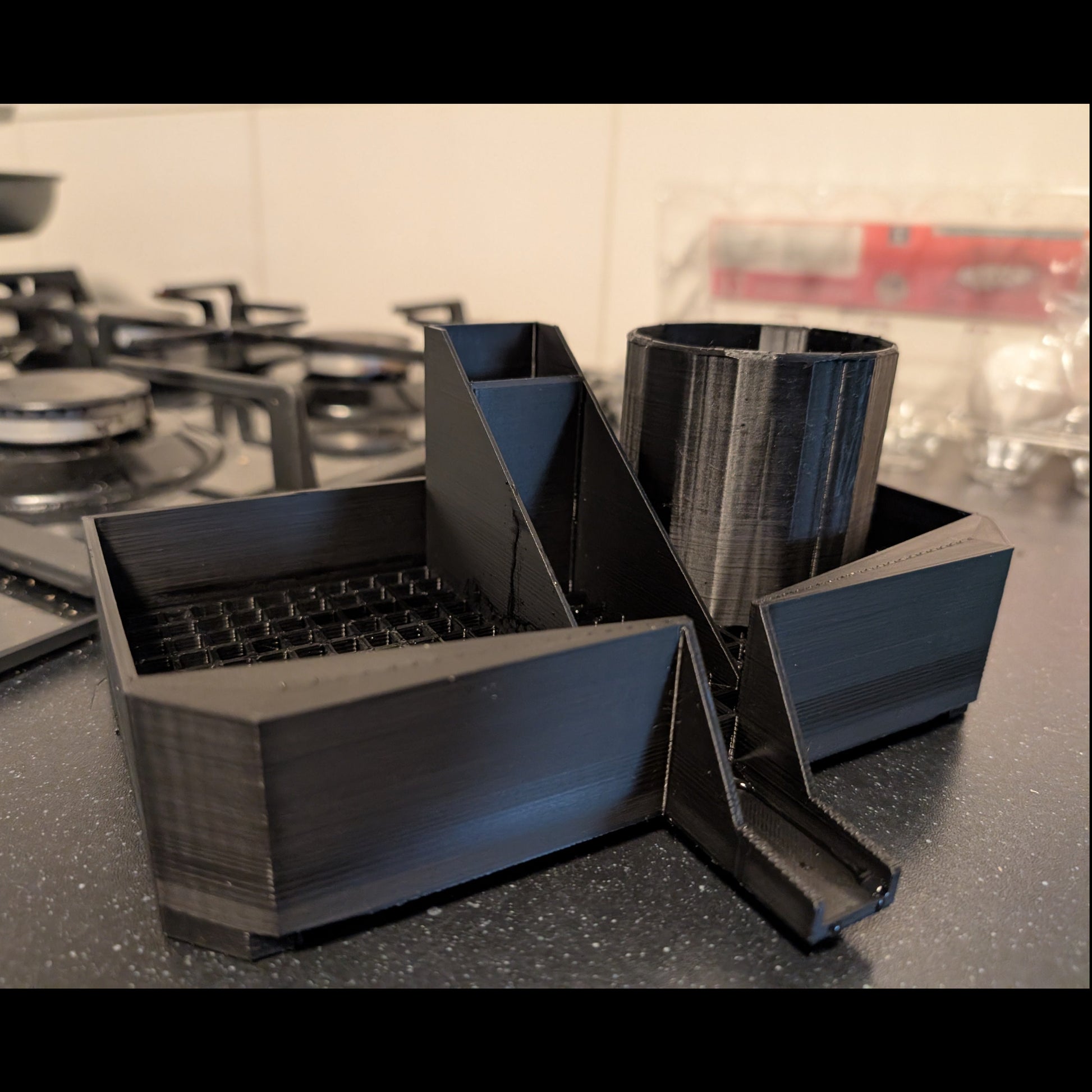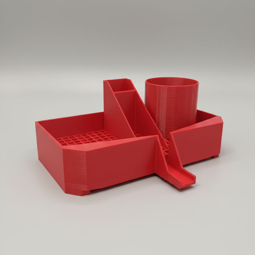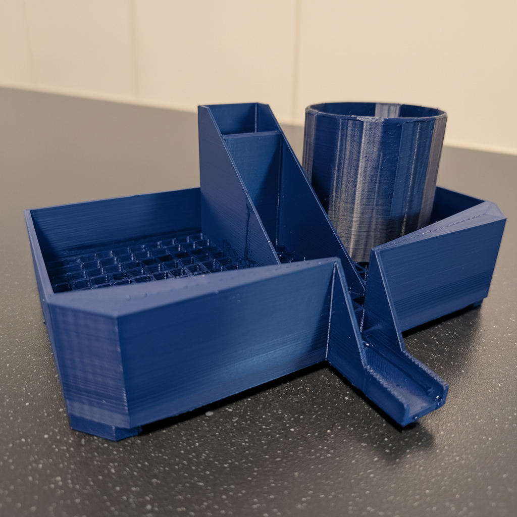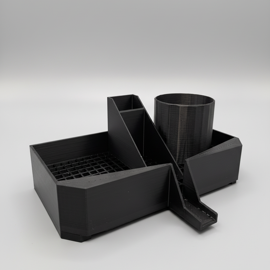 Upgrade je gootsteen met deze slimme, ruimtebesparende 3D-geprinte afdruipmand. Ontworpen om je schoonmaakspullen netjes en droog te houden, heeft hij meerdere compartimenten voor je afwasborstel, spons en afwasmiddel – alles in één strakke organizer die perfect naast je kraan past.